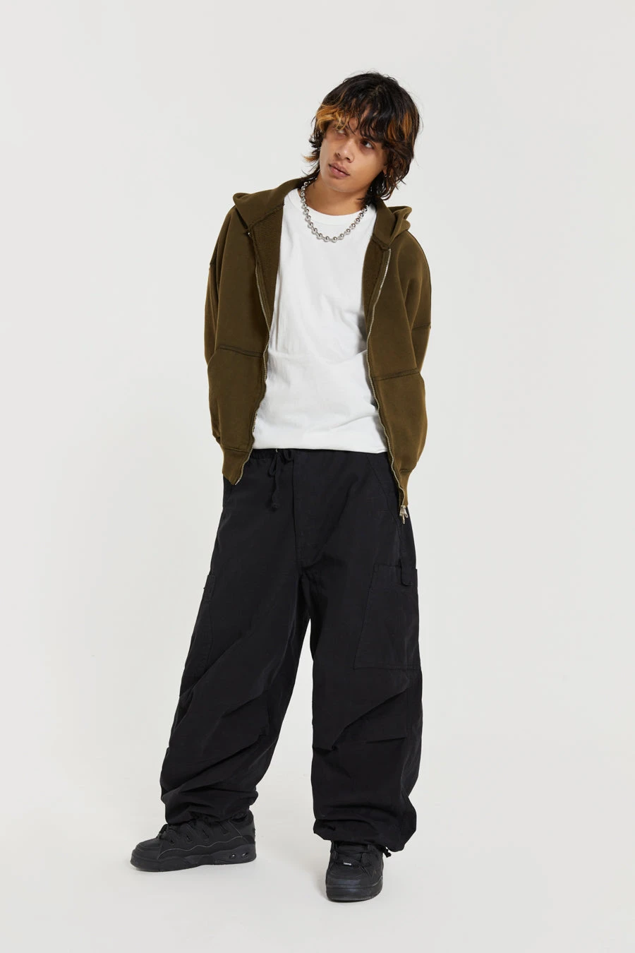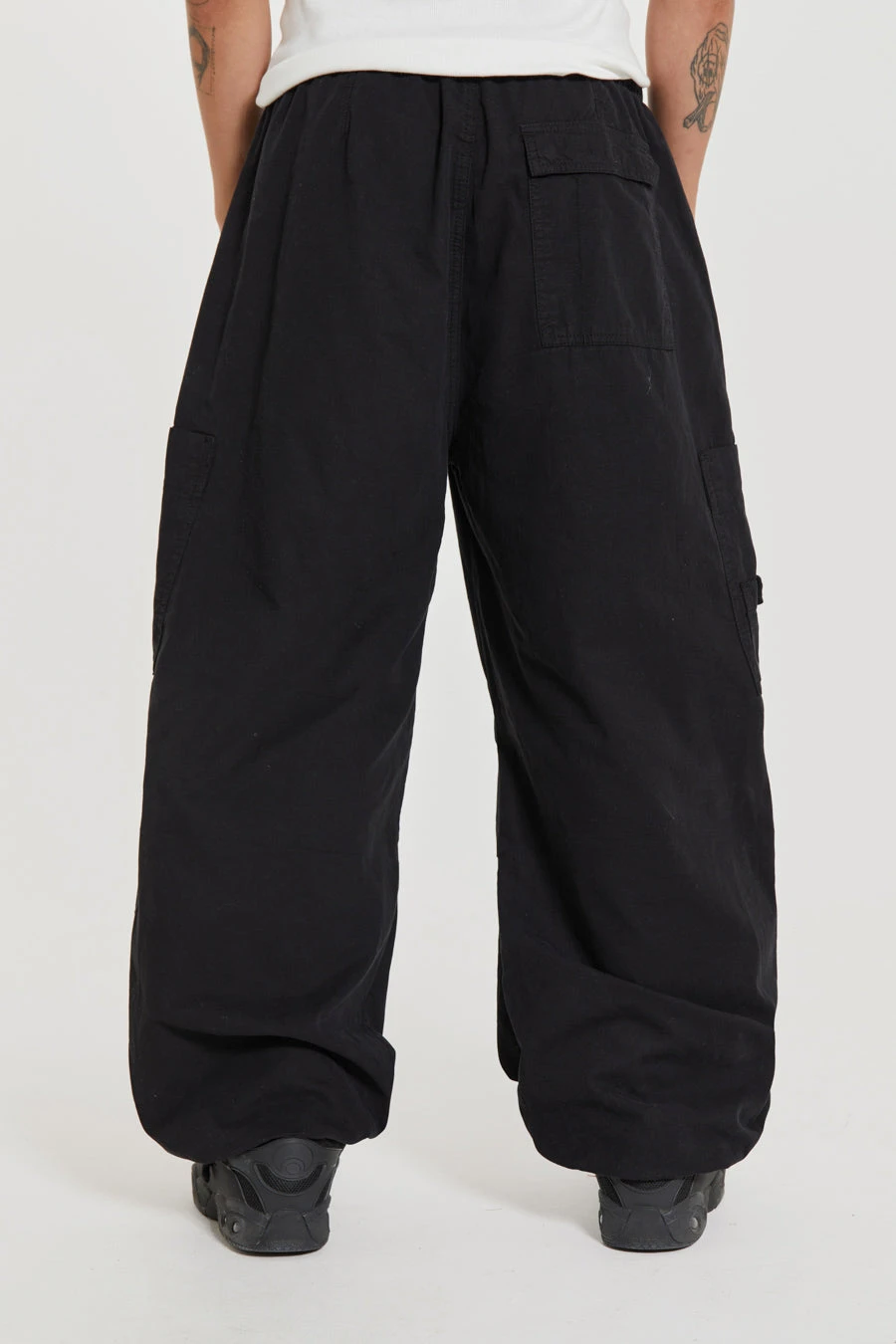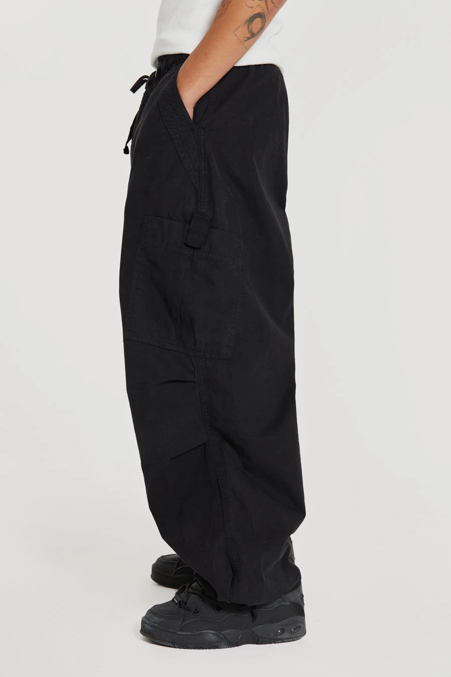 Designed with an oversized fit and a combination of metal eyelets, zip fly and adjustable cotton drawcord, our Black Parachute Cargo Pants deliver refined luxury and ultimate comfort. Details such as a pleated knee and inside leg darts ensure a perfect fit, while a six-pocket styling and a unique airpod pocket provide functional convenience. Elevate any look with this timeless and classic silhouette.