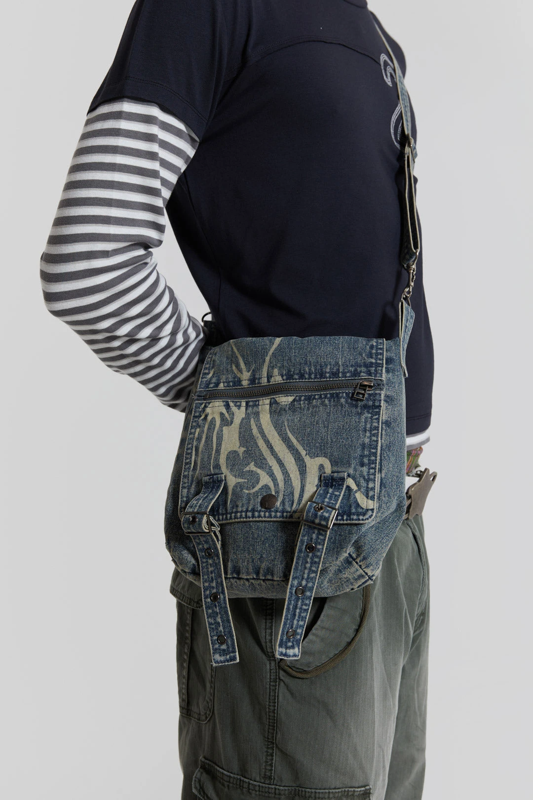 This Blue Washed Baby Satchel bag is designed with a tattoo print. The bag is crafted from mid-blue washed denim fabric and features a mini satchel cross-body shape and an adjustable strap, finished with antique silver hardware detailing.
