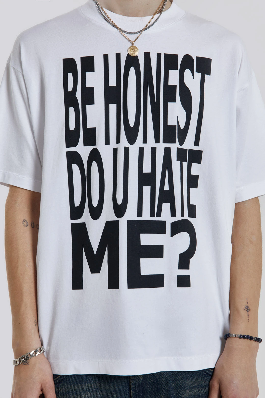 Our Honesty Tee is crafted from a white single jersey fabric, combined with a black slogan screen print. This t-shirt offers a comfortable fit with its oversized silhouette.
