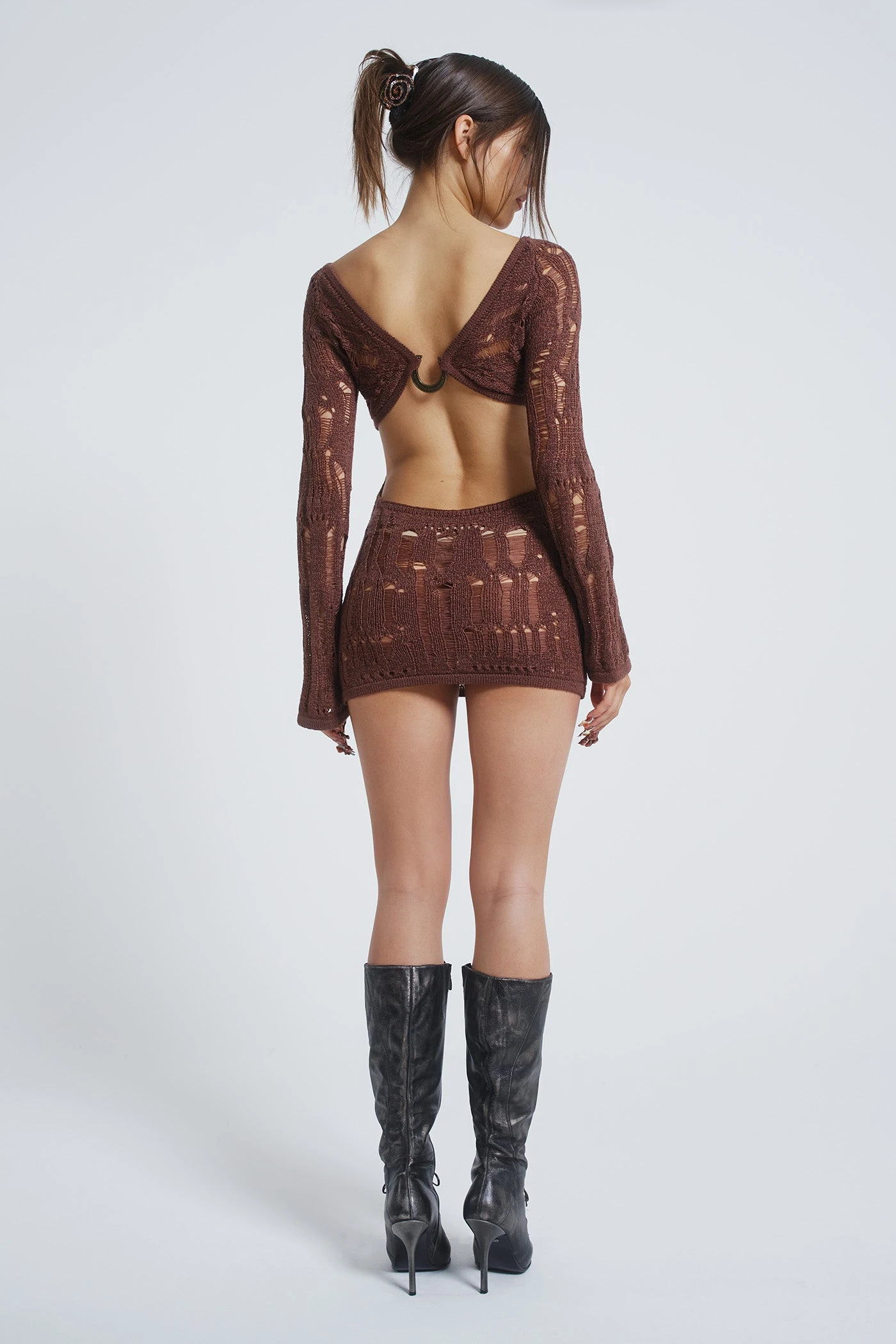 Introducing the Saddle Up 2-way Knitted Mini Dress. A refined design with a horseshoe trim. This dress can be worn both back-to-front. Crafted from a shredded laddered knit fabric in a khaki colourway, this style is constructed in a min-length.