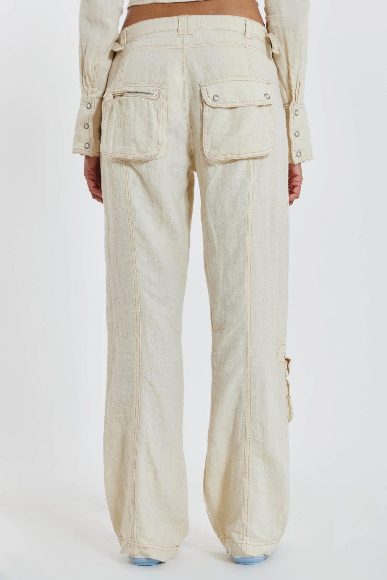 Refresh your wardrobe with the Santal Cargo Trousers. Crafted from an ecru linen fabric, these skinny fit cargo trousers feature antique silver hardware and functional cargo pockets. Complete the ensemble with the matching cargo shirt.