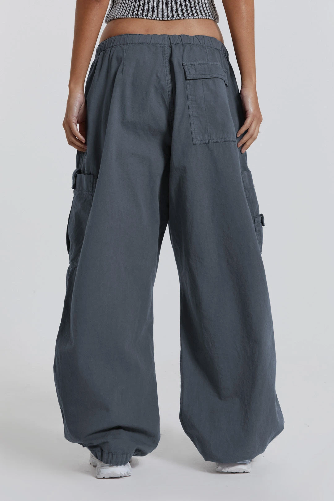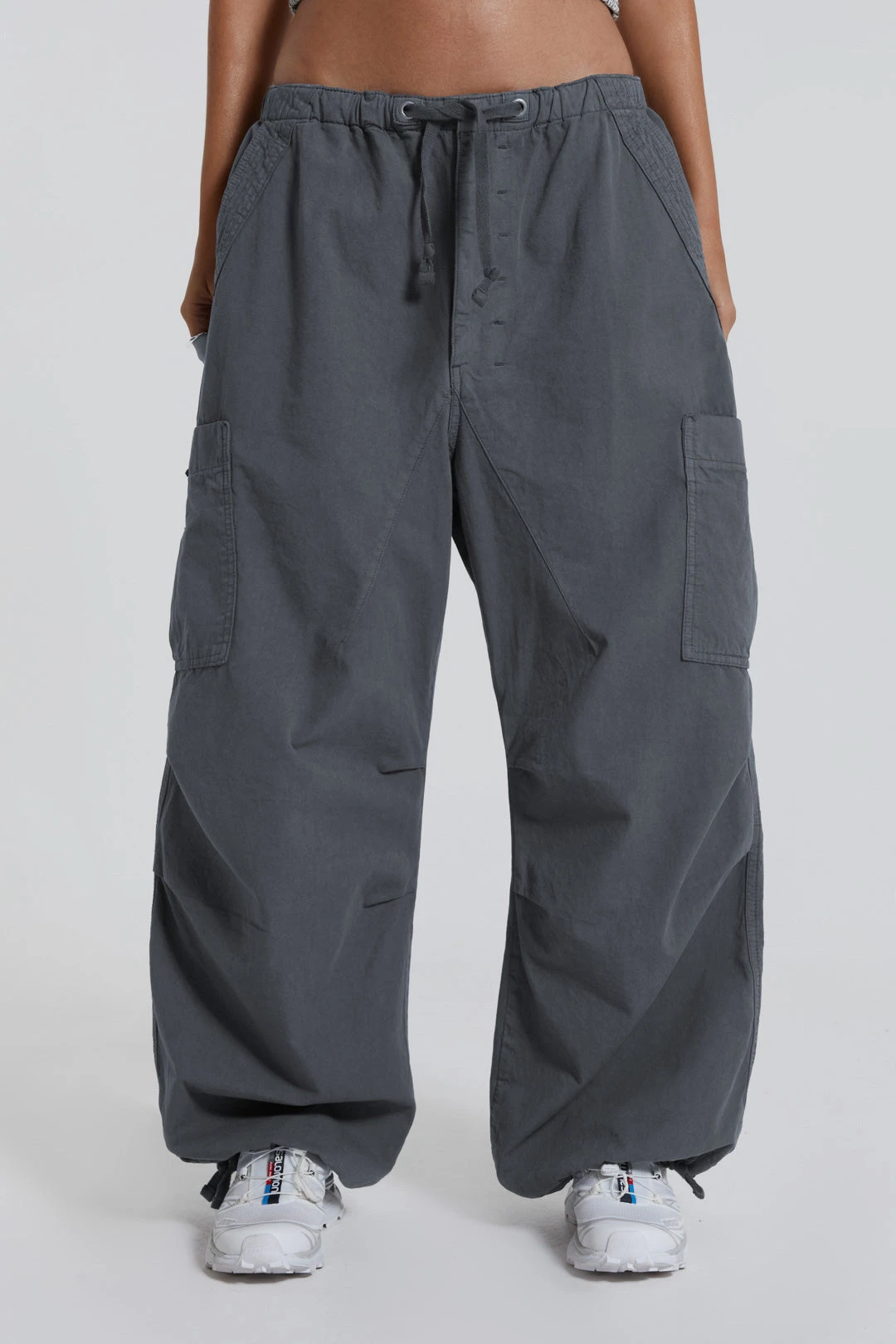 Designed with an oversized fit and a combination of metal eyelets, zip fly and adjustable cotton drawcord, our Vintage Grey Parachute Cargo Pants deliver refined luxury and ultimate comfort. Details such as a pleated knee and inside leg darts ensure a perfect fit, while a six-pocket styling and a unique airpod pocket provide functional convenience. Elevate any look with this timeless and classic silhouette.