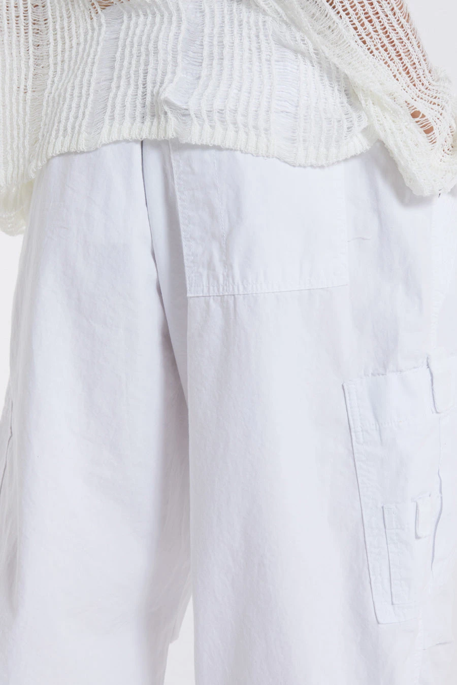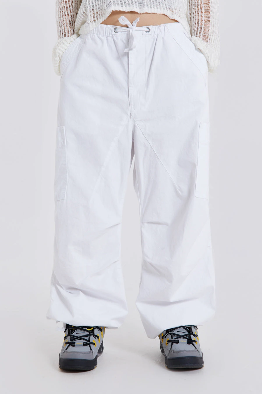 Designed with an oversized fit and a combination of metal eyelets, zip fly and adjustable cotton drawcord, our Pure White Parachute Cargo Pants deliver refined luxury and ultimate comfort. Details such as a pleated knee and inside leg darts ensure a perfect fit, while a six-pocket styling and a unique airpod pocket provide functional convenience. Elevate any look with this timeless and classic silhouette.