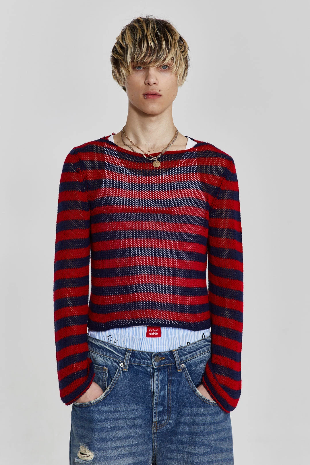 Introducing the Menace Knit, featuring a regal red and navy stripe, this piece is crafted from a slightly brushed yarn. Finished with a slash neck, cast off finish, roll hem and sleeve with a slight flare.