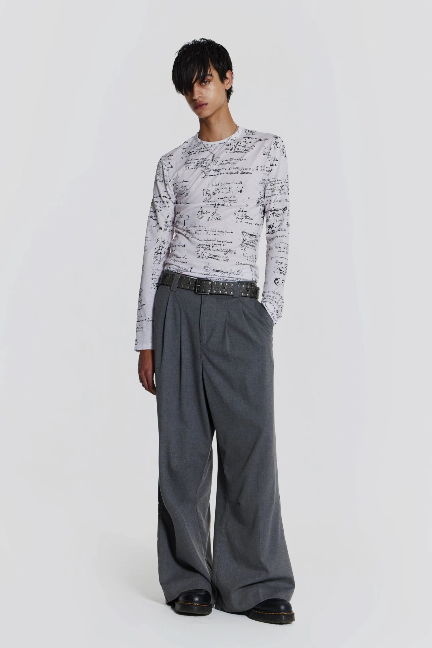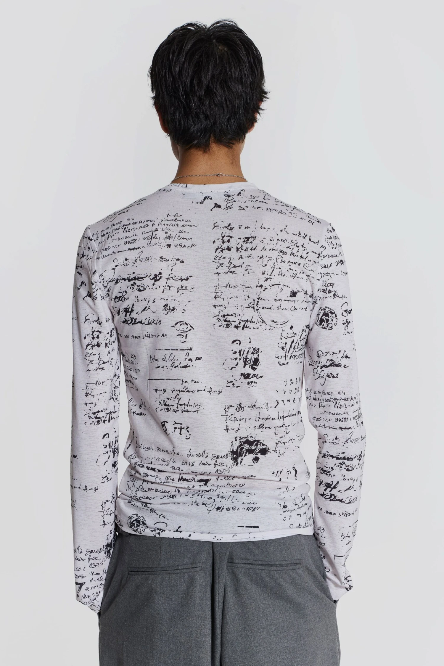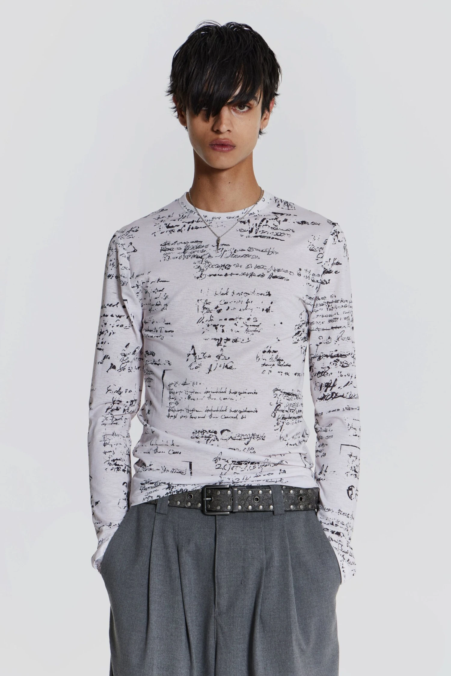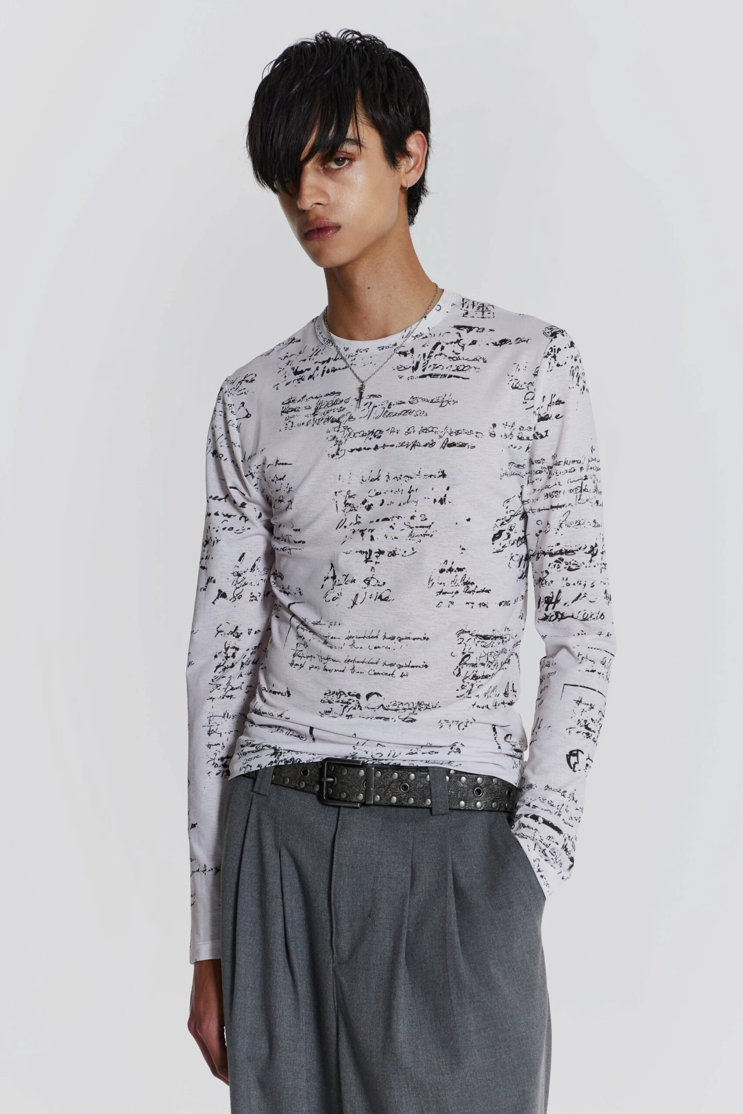 Introducing the Scripture Long Sleeve “ crafted from a tissue mesh jersey fabric, this long sleeve t-shirt features an all over script print.