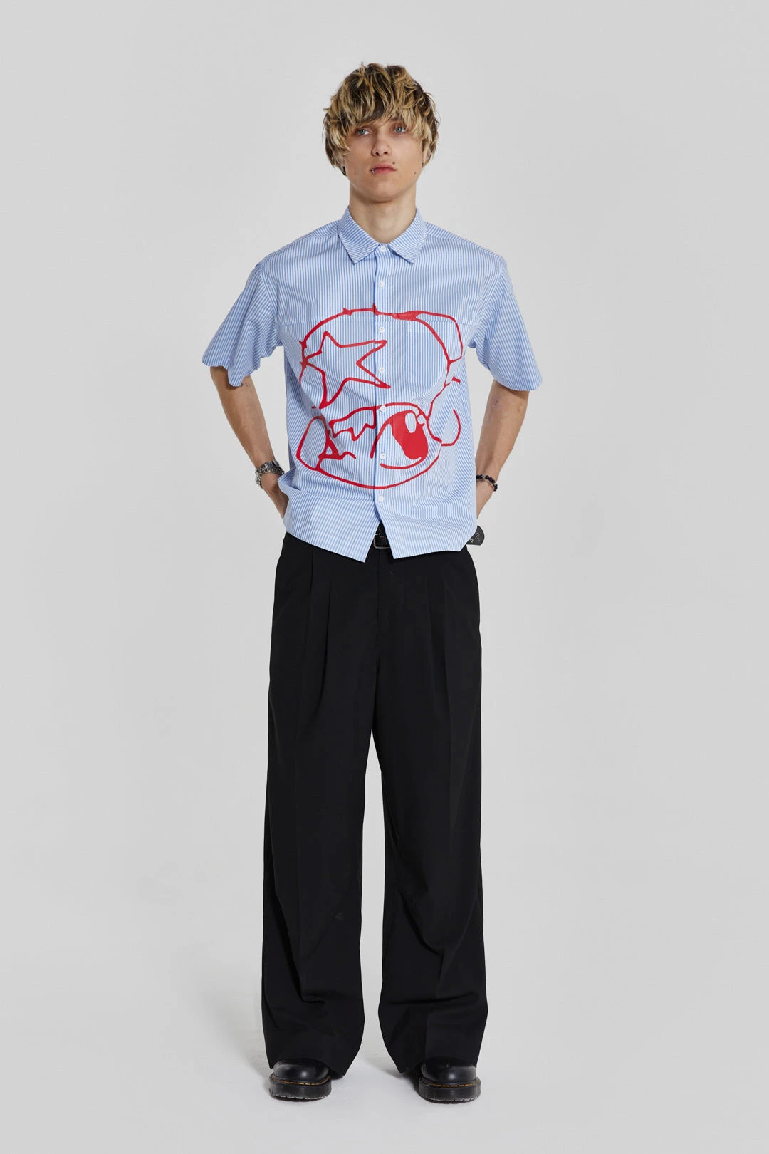 The Stereo Stripe Shirt is crafted from a soft blue stripe bottom fabric and cut to a boxy fit with a slightly cropped length. Boasting a front yoke pocket detail, the shirt is finish with a large placement screen print, designed exclusively for Jaded by Poster.