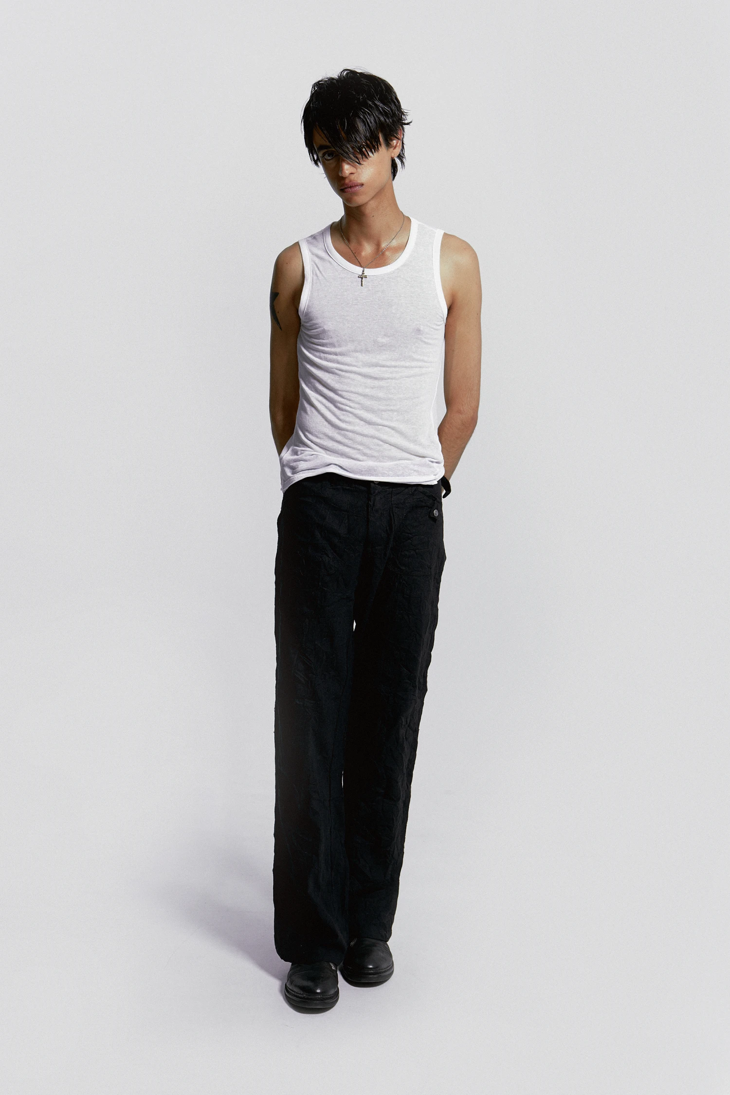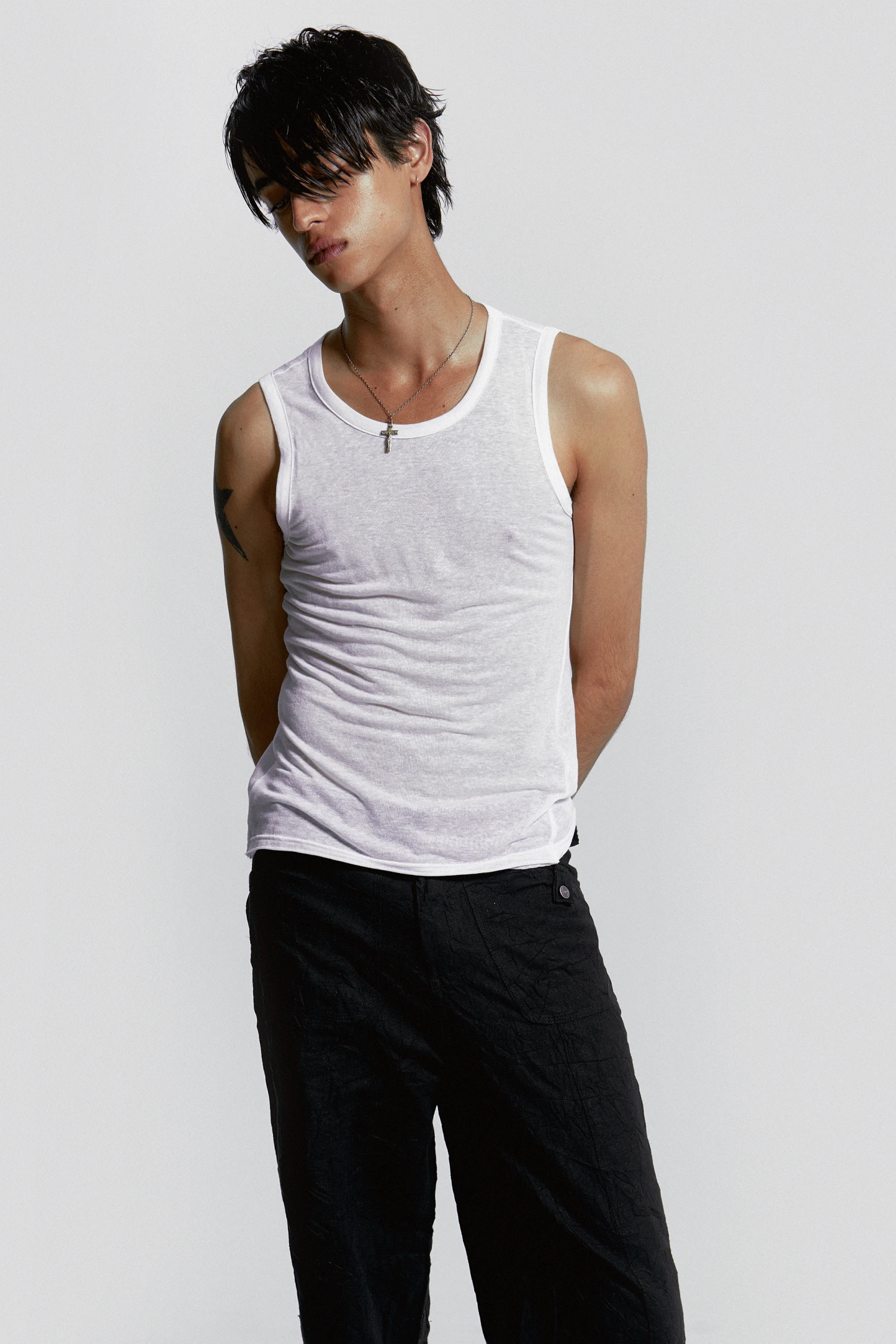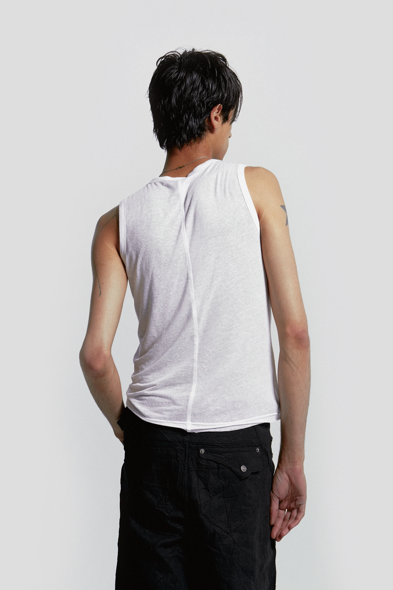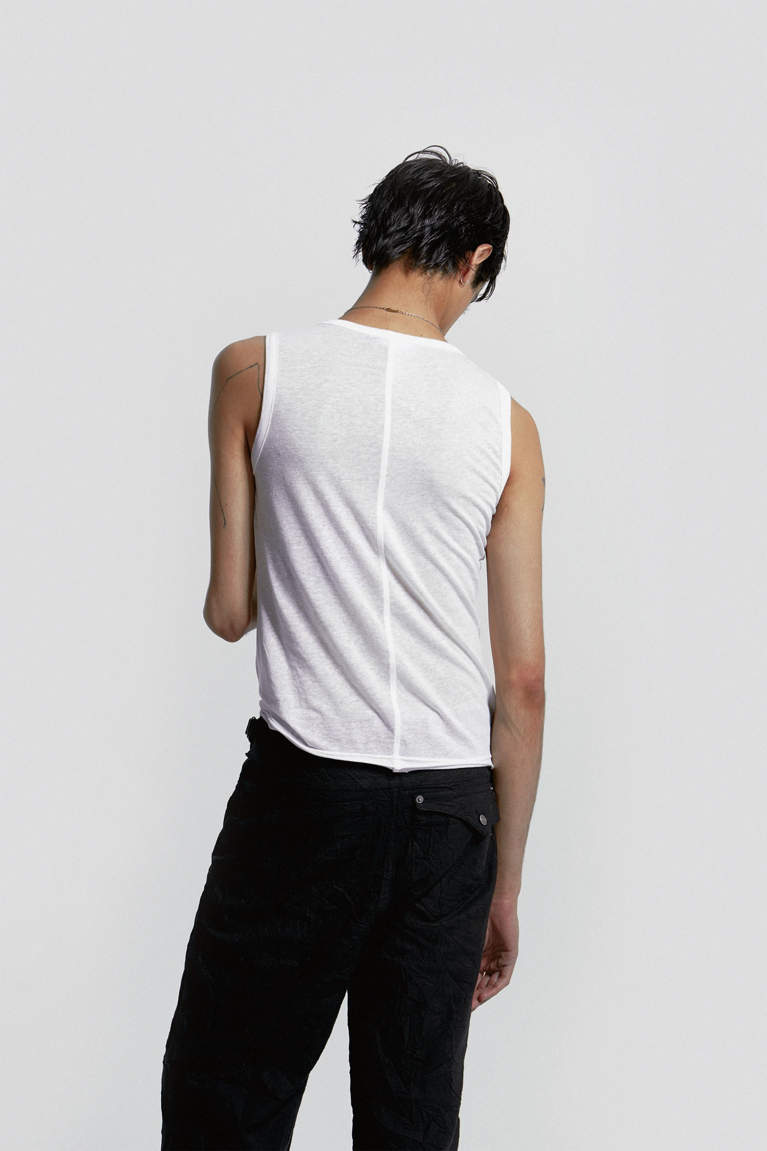 Our White Mist Vest is constructed with sheer fabric for a soft hand feel in a white colourway. The sleeveless vest is cut in a slightly cropped fit with a twisted side steam detail.